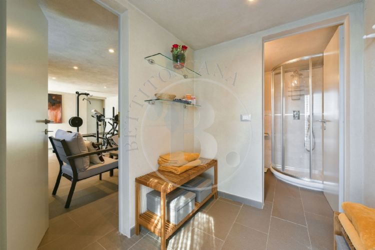 The property has a total surface area of 210 sqm, spread over three levels, and features a stunning terraced garden with a panoramic swimming pool. Additionally, there is a pool house with a gym, bathroom, and changing room.