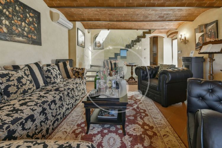 There are internal designer stairs made of pietra serena, steel, and glass which lead to the upper floor, where you can find a welcoming lounge, a double bedroom with an ensuite bathroom, and two other elegant bedrooms with two bathrooms.