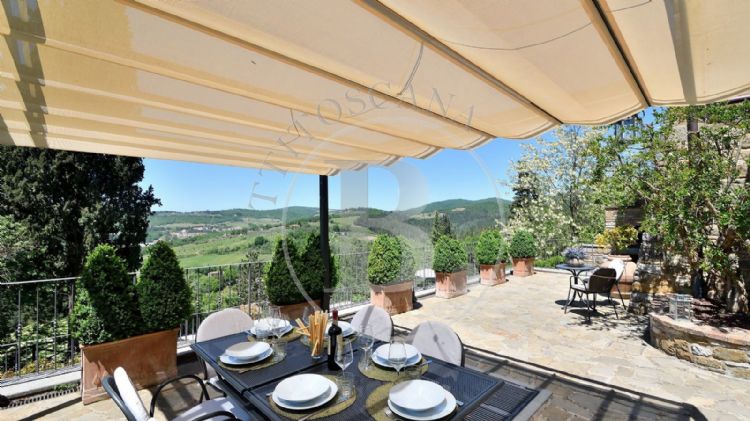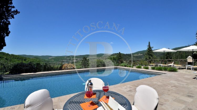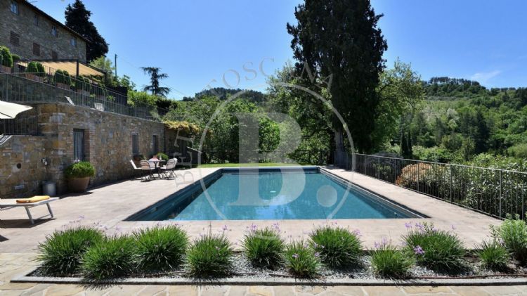 The terraced garden is also very unique, consisting of three different levels. Each level is designed for a specific purpose: the convivial area is intended for enjoying open-air meals with a stunning panoramic view, the lawn has the pool house, gym, bathroom, and changing rooms, and lastly the swimming pool and the splendid panoramic solarium permits to relax and enjoy the typical Chianti landscape among olive trees, cypresses, vineyards and medieval villages.