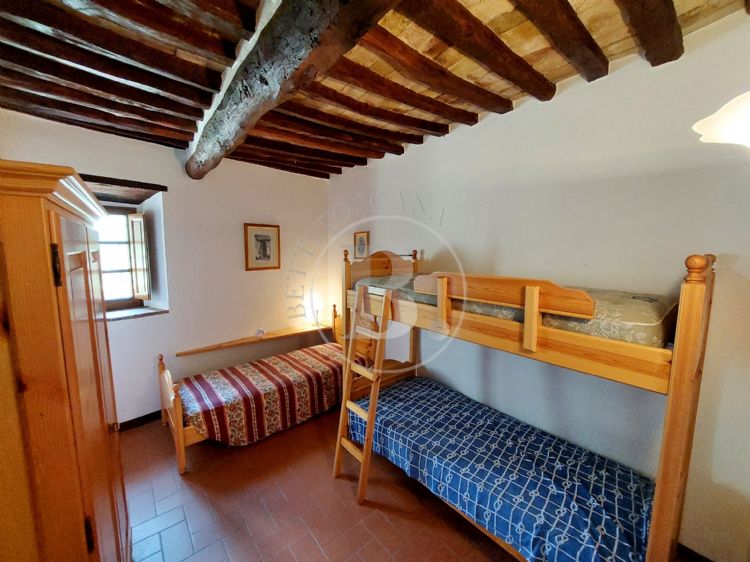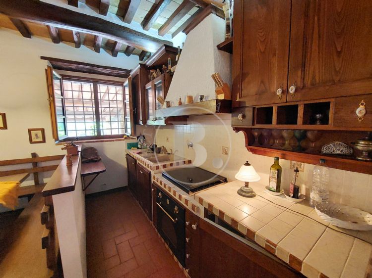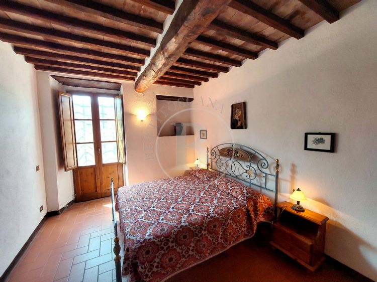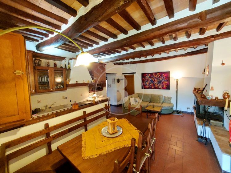 The one to the east is characterized by charming loggia covered in pantiles and tiles with beams and bricks in the ceiling and an original terracotta flooring; three stone steps lead us inside the apartment where we find a cozy living room with kitchenette and fireplace, the hallway leads to the bathroom with window and to the two bedrooms, the main one of which has a direct exit onto the south-facing garden characterized by a second covered loggia with a ceiling in wooden beams, tiles and tiles and from which you can enjoy a wonderful panoramic view.