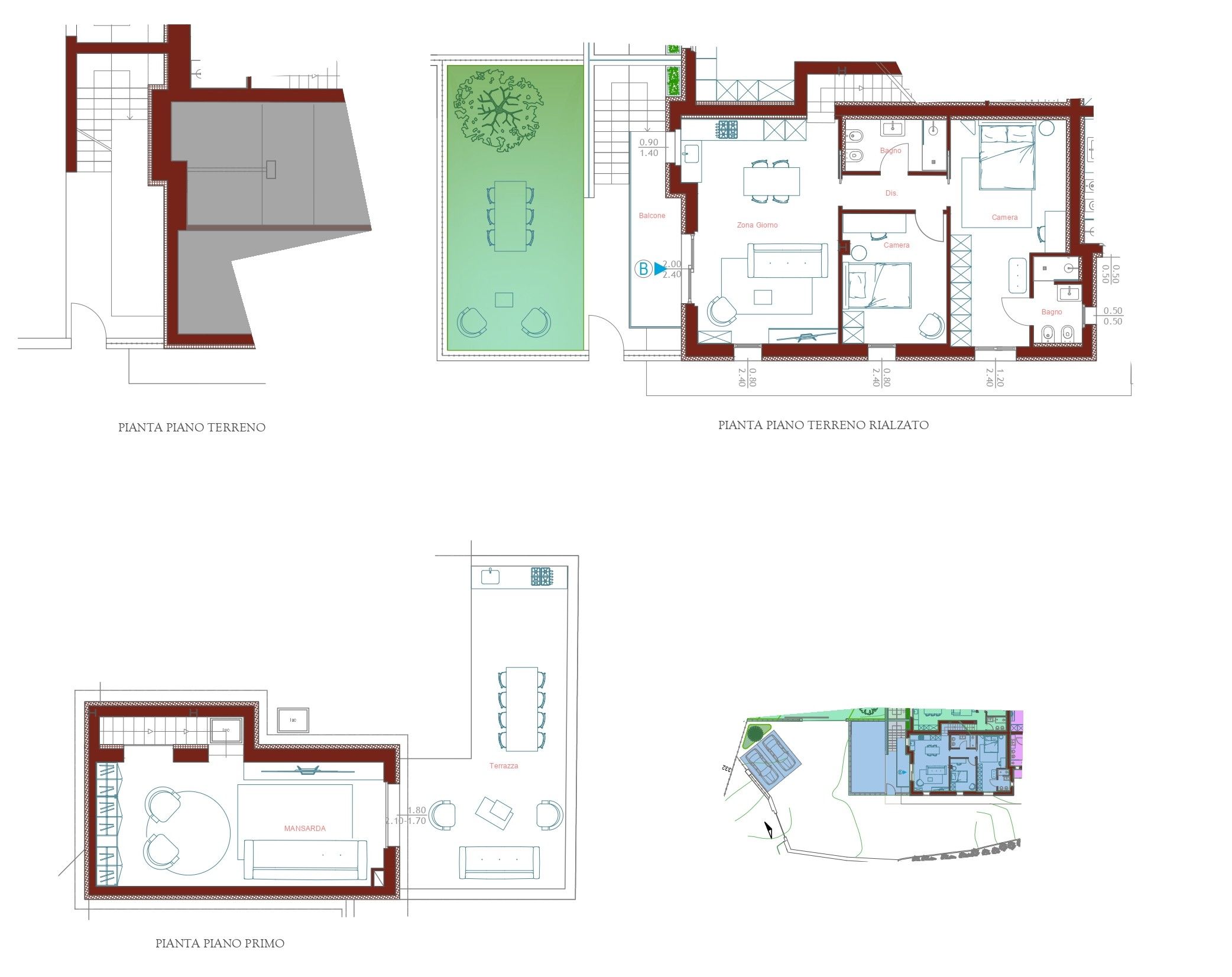 Apartment B (highlighted in blue on the floor plan) has a floor area of 84 square meters, along with a 36 square meter attic. It is spread over two levels. The raised ground floor features an entrance from a private courtyard, a spacious and bright living room with a kitchenette, a hallway, two double bedrooms, and two bathrooms. The first floor, accessible via an internal staircase, includes an attic room that opens onto a stunning 45 square meter panoramic terrace.