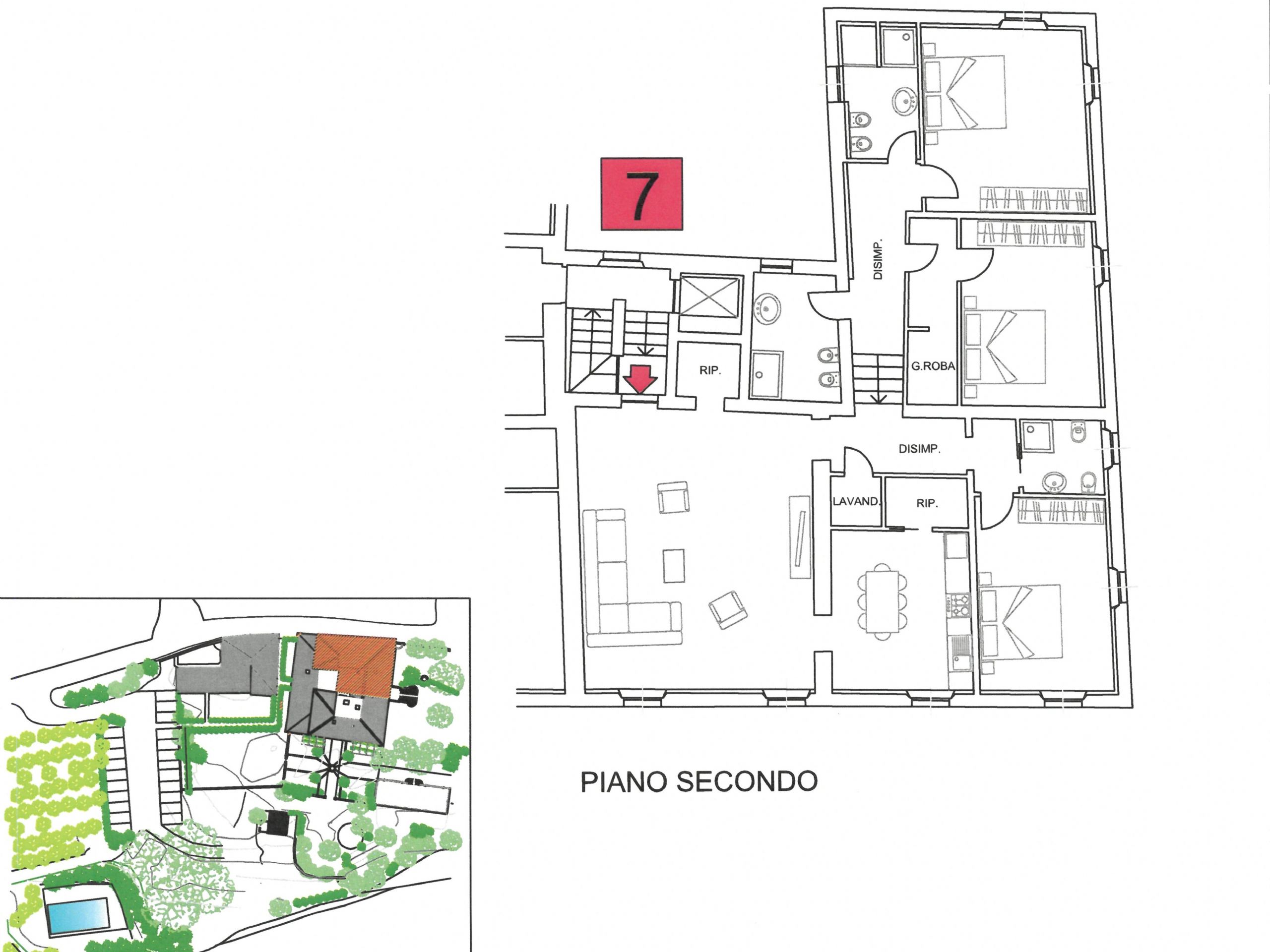 **Apartment 7**: Located on the second floor and spanning a single level of 170 square meters, this apartment includes a large living room, an eat-in kitchen, three double bedrooms, three bathrooms, and a storage room.