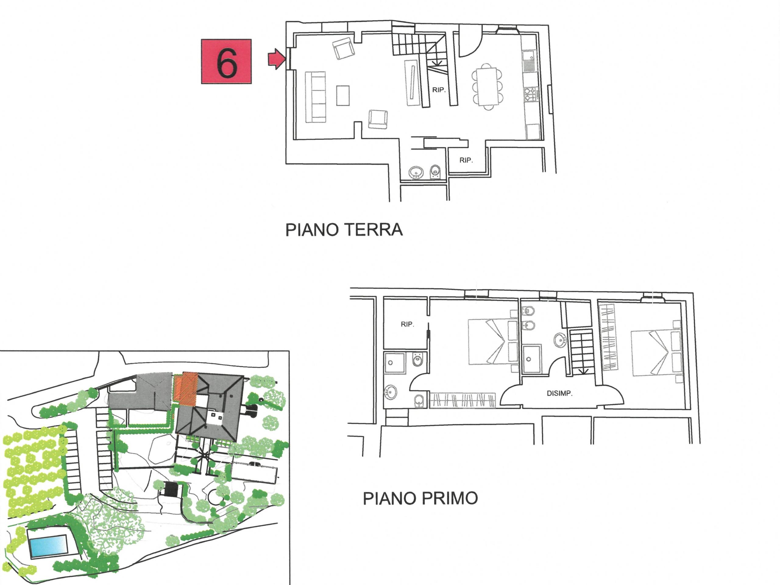 **Apartment 6**: This two-level apartment measures 120 square meters. The ground floor features a living room, a dining room, an eat-in kitchen, a bathroom, and a storage room. The first floor includes two double bedrooms and two bathrooms, along with a 26 square meter private courtyard.