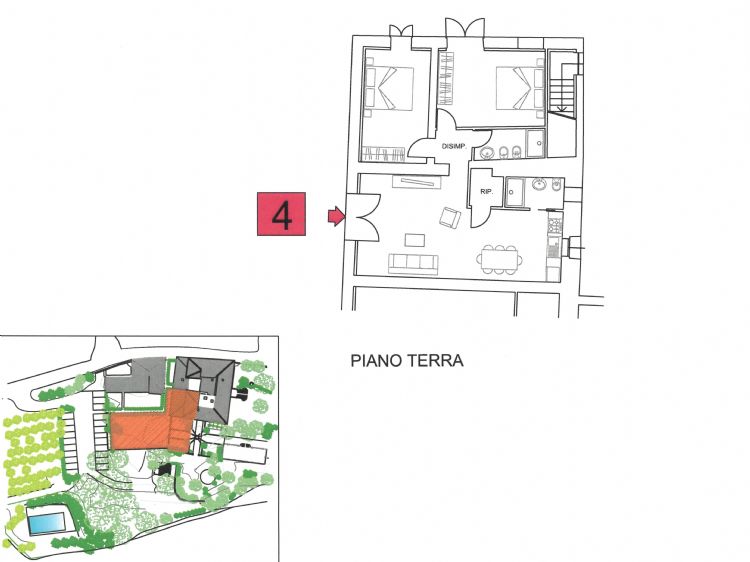 **Apartment 4**: This ground-floor apartment spans a total of 90 square meters, comprising a living room, an eat-in kitchen, two double bedrooms, two bathrooms, and a storage room. It also offers a private courtyard of 390 square meters.