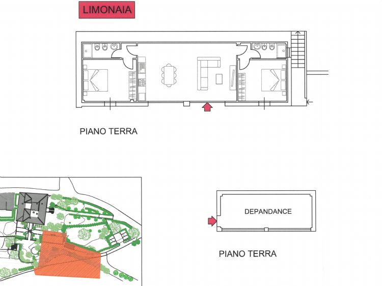 **Limonaia**: A ground-floor, single-level apartment of 96 square meters featuring a large living area, an open-plan kitchen, two bedrooms, a bathroom, and a storage room. This unit also boasts a 1,230 square meter private courtyard.