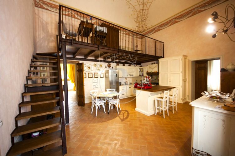 The living room leads to a bathroom and to the dining room also frescoed with a height of 6 mt from which you reach the well-kept kitchen with a characteristic mezzanine/studio above.