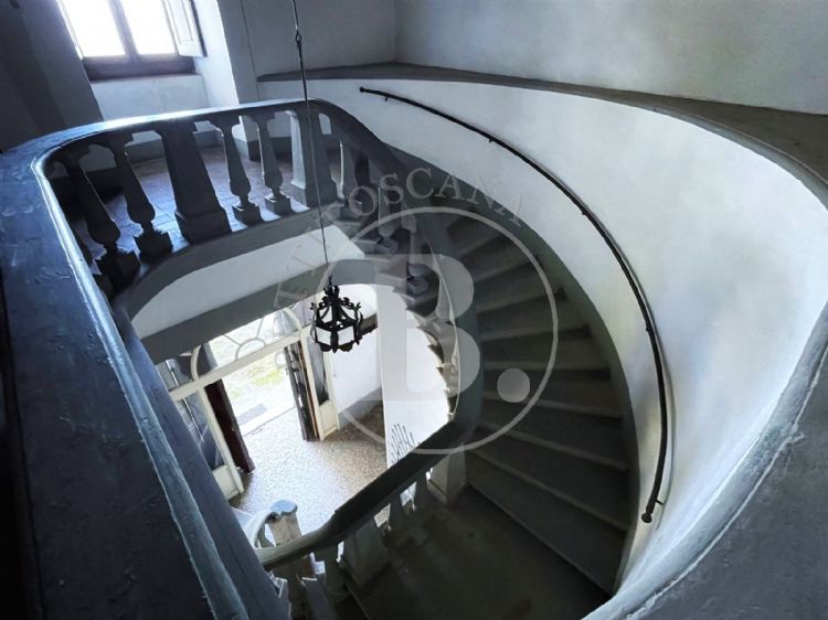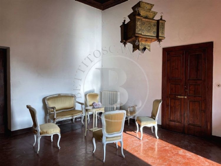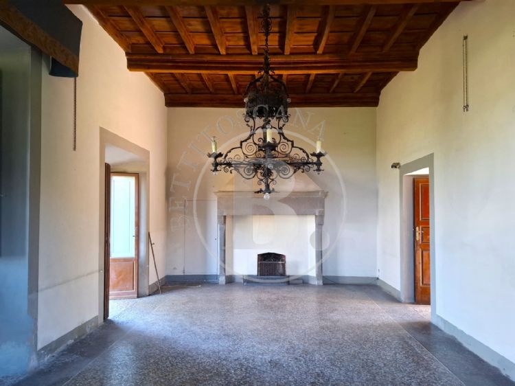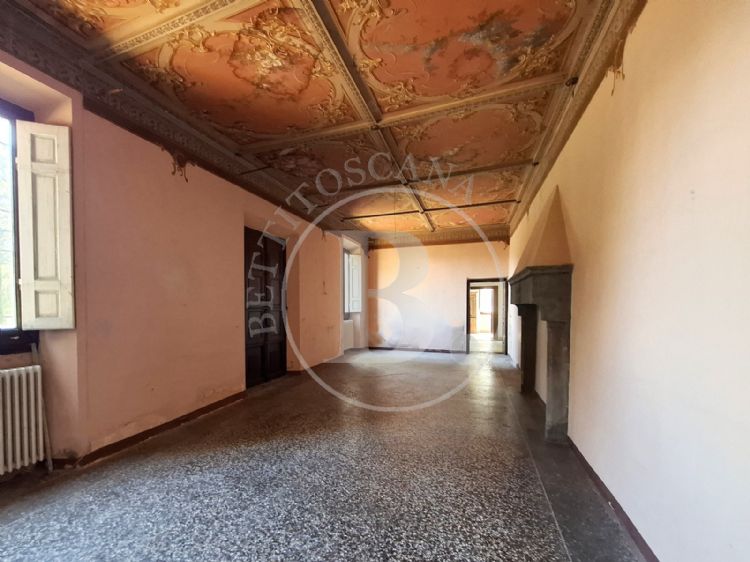 • Main Villa (1,100 sqm): Spanning two above-ground floors plus a panoramic tower, the villa features exquisite period details, including frescoed halls, original pietra serena fireplaces, coffered ceilings, and richly atmospheric rooms.