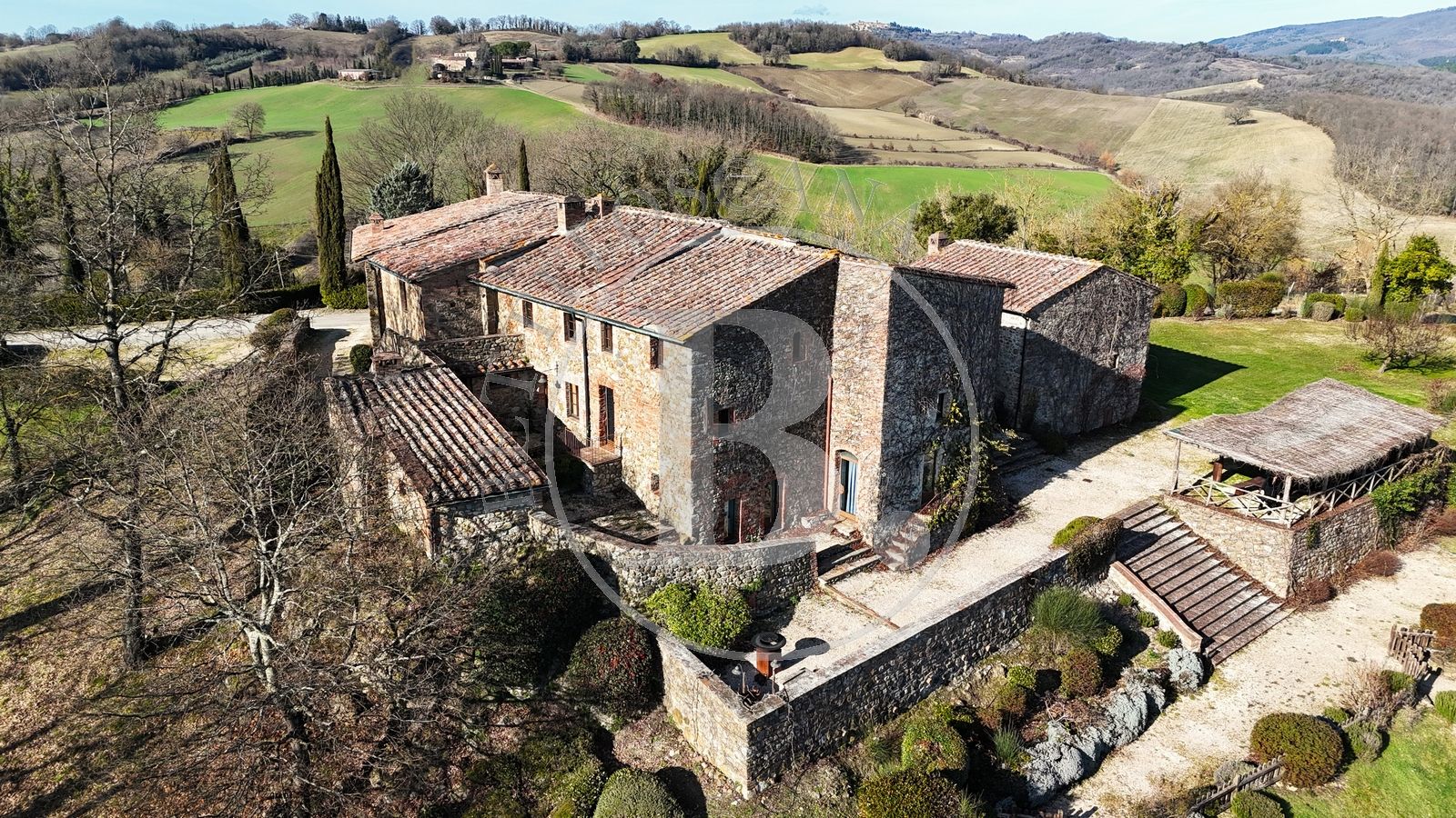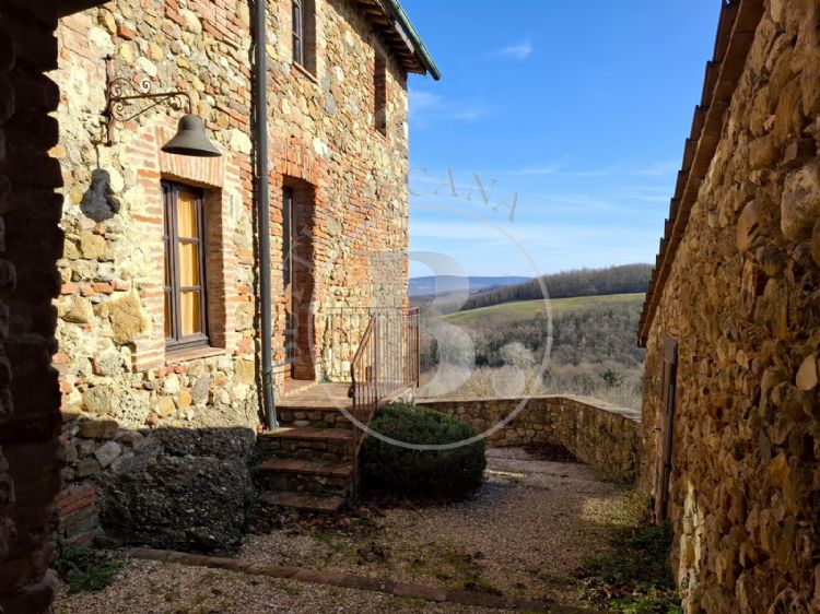 The property enjoys a panoramic, private, and not isolated location, a short distance from a characteristic medieval village. Siena is about 40 minutes away, an hour from the sea, and just minutes from the Abbey of San Galgano, a symbol of spirituality and history.