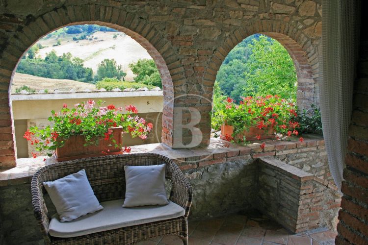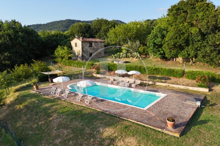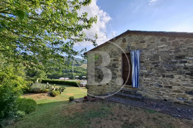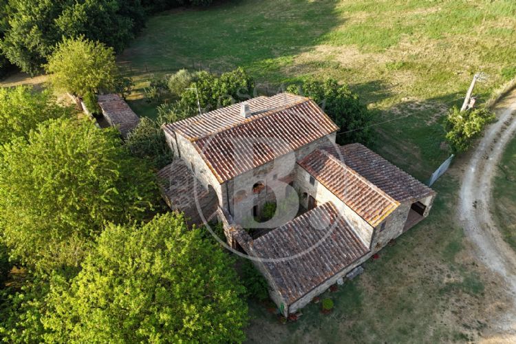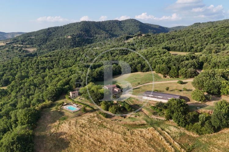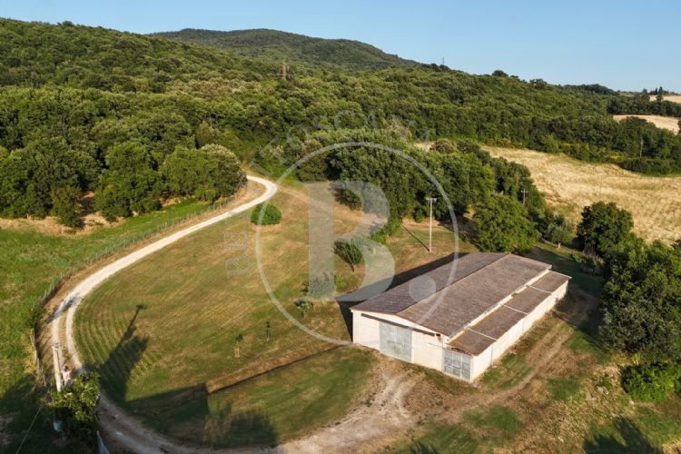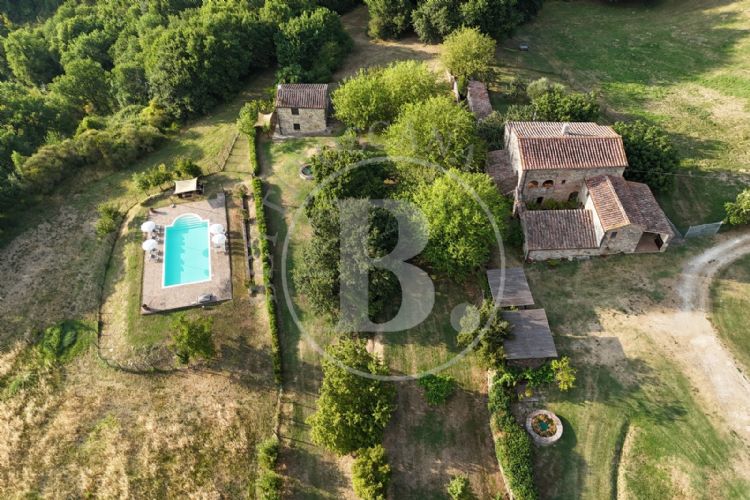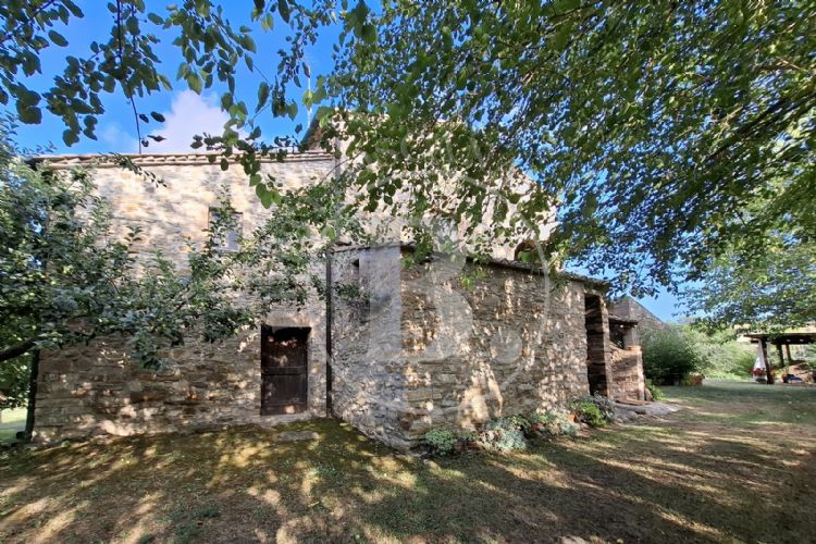 The property consists of an ancient STONE FARMHOUSE of about 450 square meters on two levels with an adjacent BARN of about 100 square meters, an AGRICULTURAL SHED of about 500 square meters, and an ANNEX (the old ‘Castri’) of about 25 square meters; the surrounding land is about 27 hectares, woodland, and arable land.