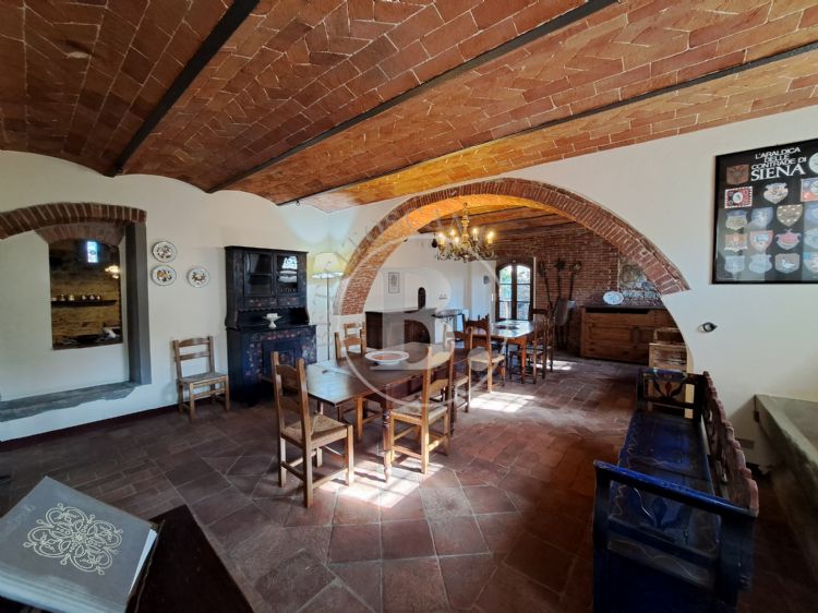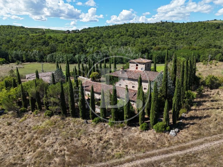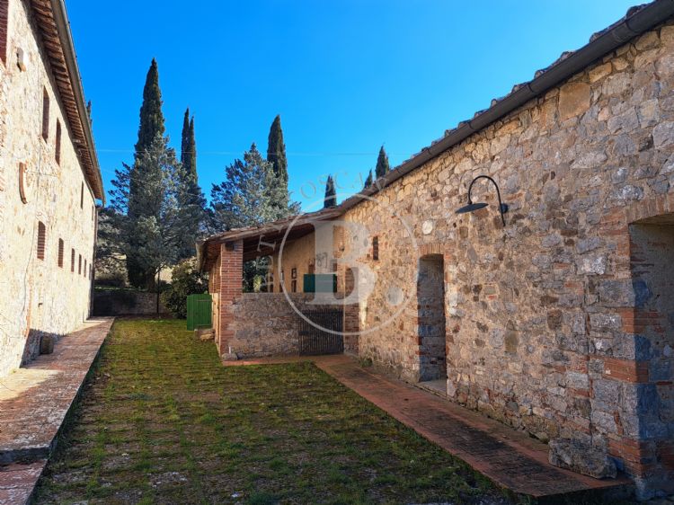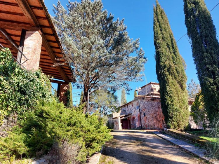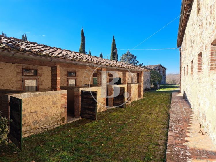 The property is located between Gaiole in Chianti and Siena and consists of three buildings: the main farmhouse with a typical colombaia tower, the renovated barn unfinished inside, and the former stables/storages.