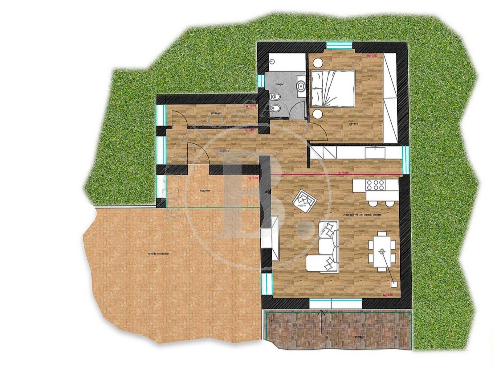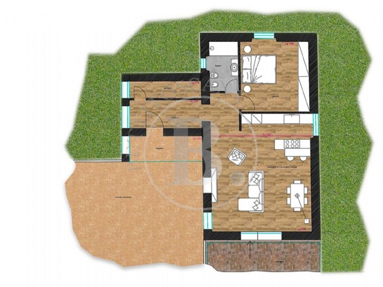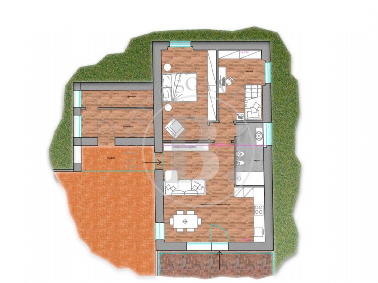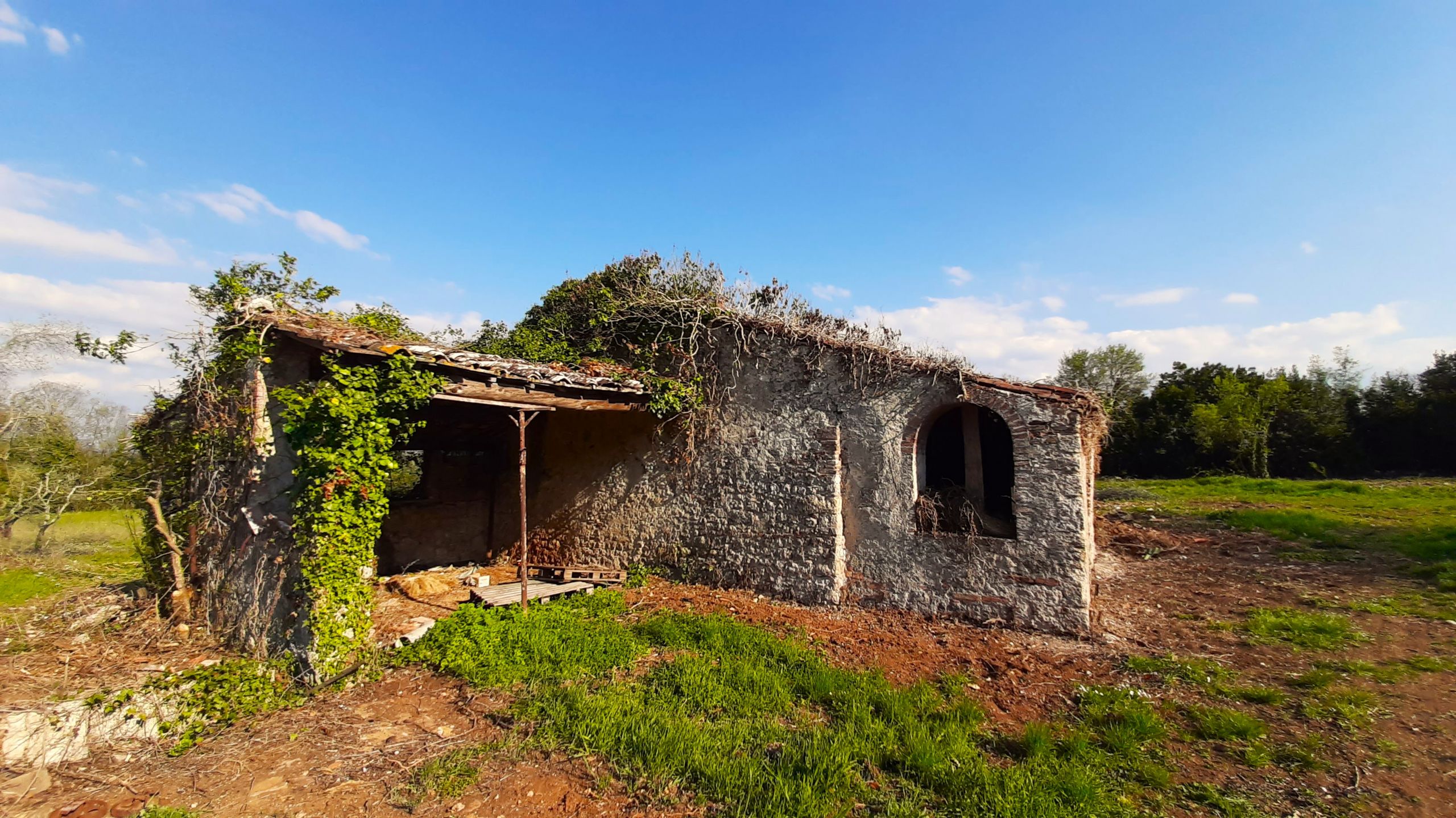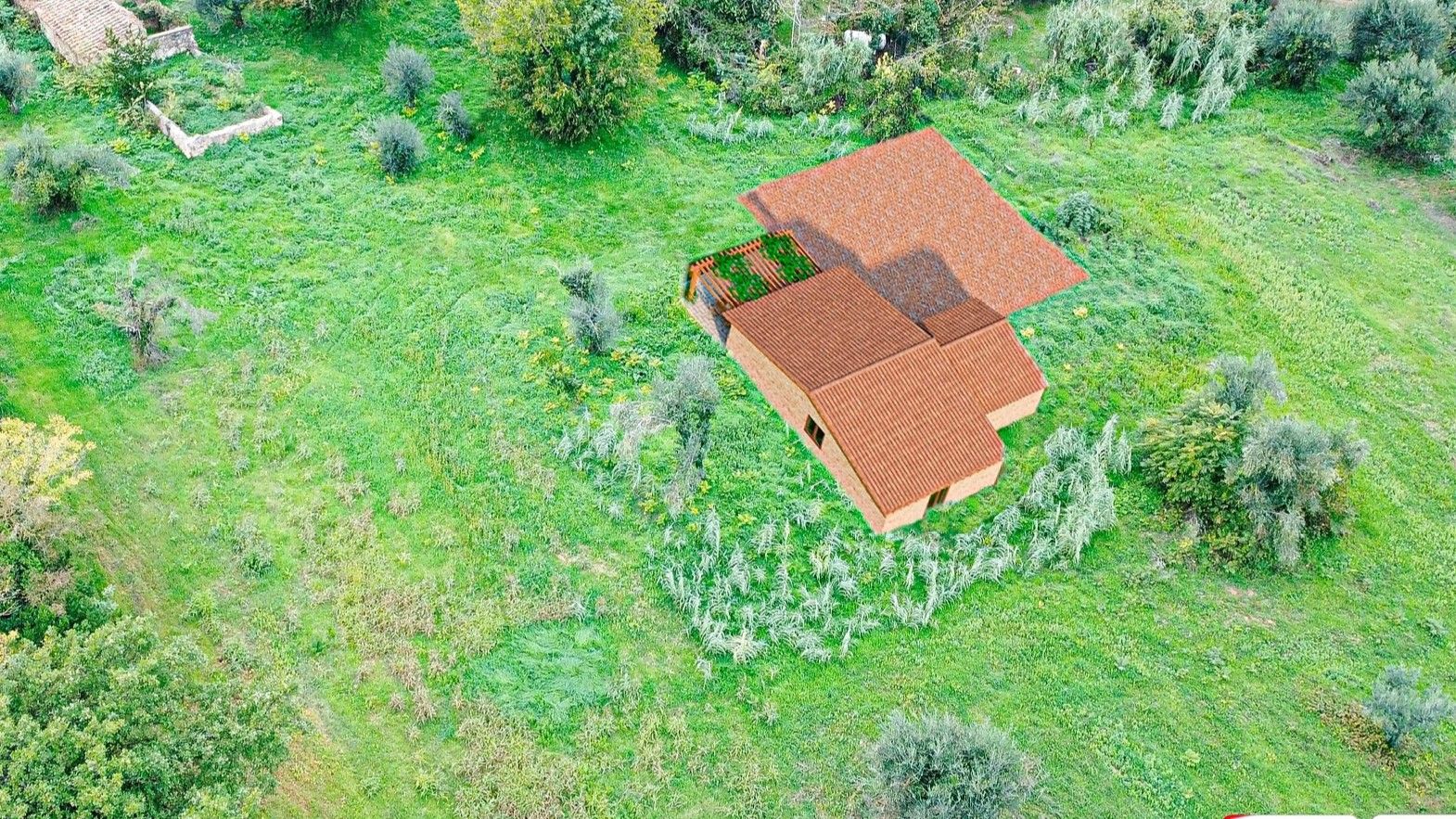 A preliminary project has been developed, envisioning the restoration of a detached residential unit that will consist of a kitchen, living room, a large double bedroom (or a double bedroom and a single bedroom), a bathroom, and a storage/laundry room, as well as an outdoor pergola.
