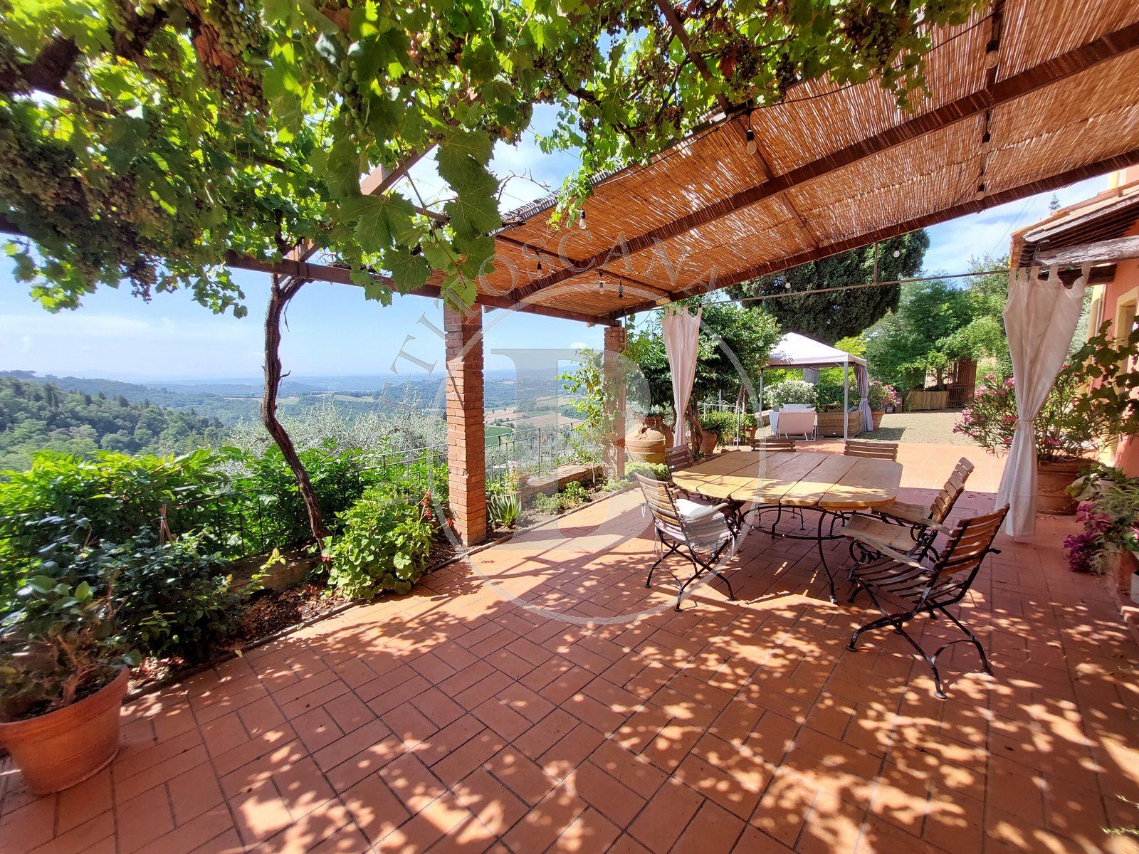 The property boasts a 120-square-meter terrace with a breathtaking panoramic view that stretches to San Gimignano and its ancient towers. From the terrace, a few steps lead down to the garden, pool house, and a (10 x 4 mt) infinity pool with a salt system, all naturally framed by olive trees and cypresses, offering a splendid view.