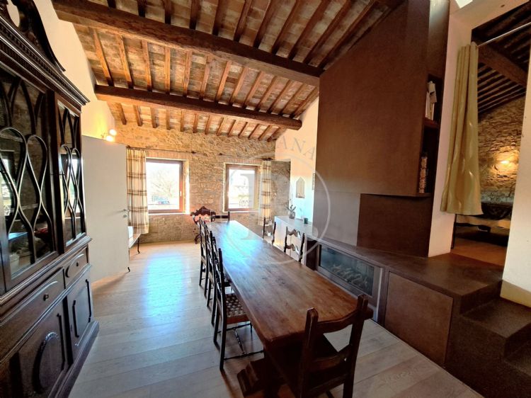 On the ground floor, a charming living area is characterized by several rooms, a large kitchen, a room with a fireplace on two levels, the living/dining room, and the relaxation area with sofas and armchairs. From here you enter the suggestive cellar with a brick ceiling and terracotta floor.