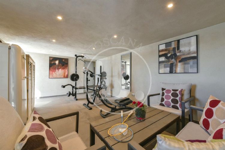 The property has a total surface area of 210 sqm, spread over three levels, and features a stunning terraced garden with a panoramic swimming pool. Additionally, there is a pool house with a gym, bathroom, and changing room.