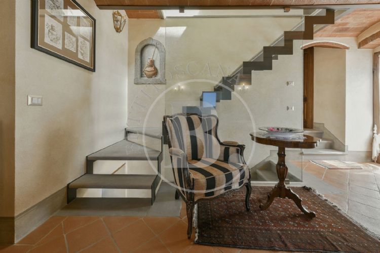There are internal designer stairs made of pietra serena, steel, and glass which lead to the upper floor, where you can find a welcoming lounge, a double bedroom with an ensuite bathroom, and two other elegant bedrooms with two bathrooms.