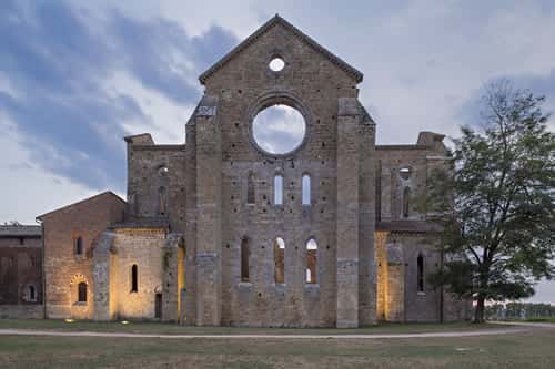 A fianco, la quiete della Val d'Arbia accompagna lungo filari di pioppi, introducendo ad un lento risalire di colli che culminano nell'apice turrito di Montalcino, patria del pregiato Brunello.