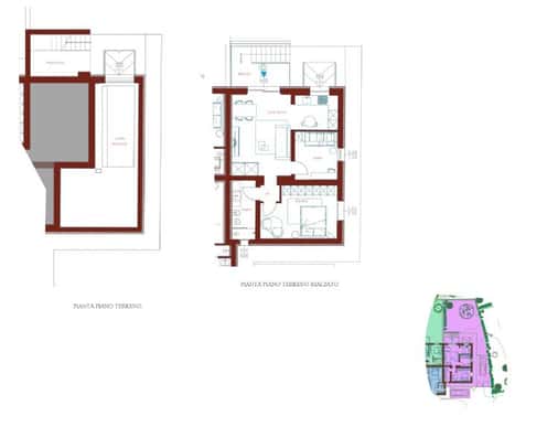 L'appartamento C (rosa in pianta) ha una superficie di mq. 67 e si sviluppa su un unico livello al piano terra rialzato; internamente si compone di ingresso da resede esclusivo, soggiorno con angolo cottura, disimpegno, camera matrimoniale, studio e bagno finestrato.