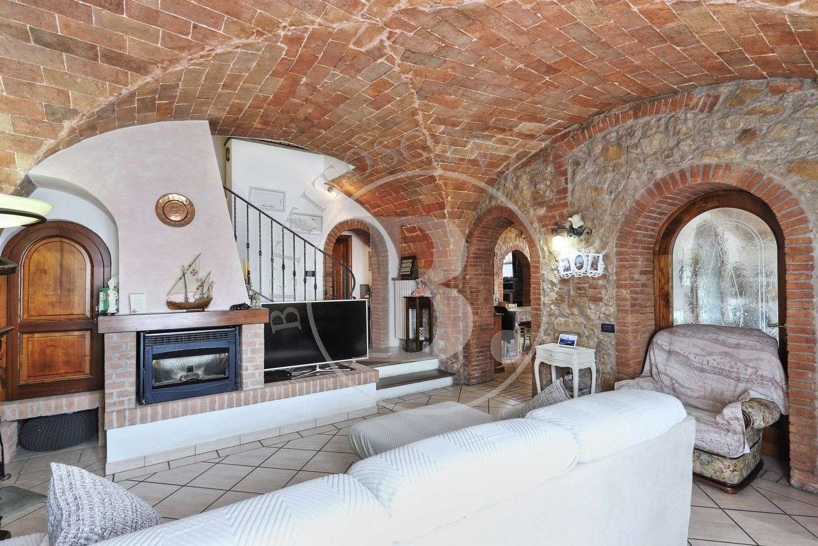 - al piano terra, al quale si accede dall’ampio loggiato esterno, troviamo un ingresso/pranzo, la cucina, un ampio soggiorno con termocamino, uno studio o camera, un’ampia taverna con camino, un bagno ed un ripostiglio, il tutto caratterizzato dalle splendide volte a crociera e dalle