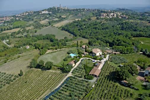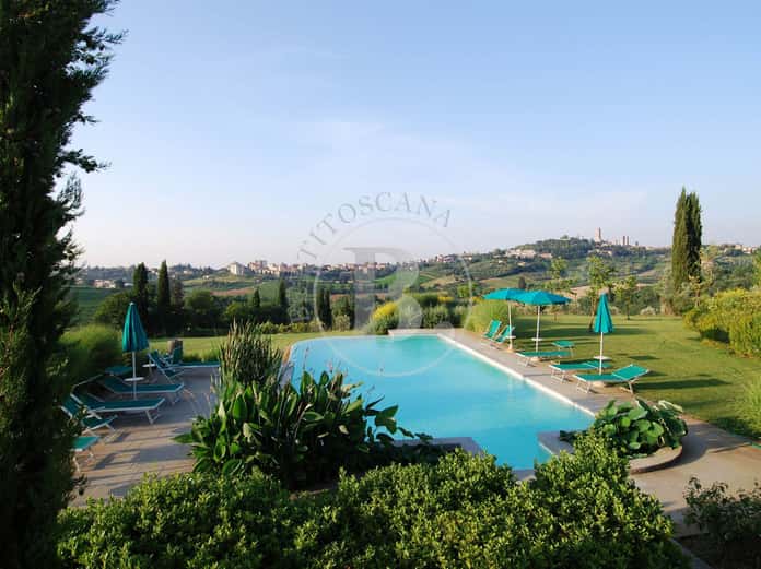 Prestigiosa proprietà in vendita nella campagna di San Gimignano con vista esclusiva sulle torri, caratterizzata da un complesso agrituristico suddiviso in 7 appartamenti oltre a cantina e magazzini per complessivi mq. 900, circondato da 3 ettari di terreno con parco e piscina.