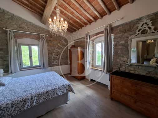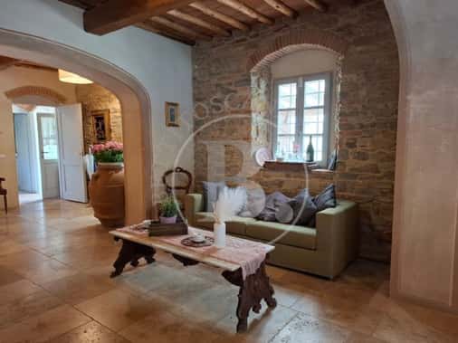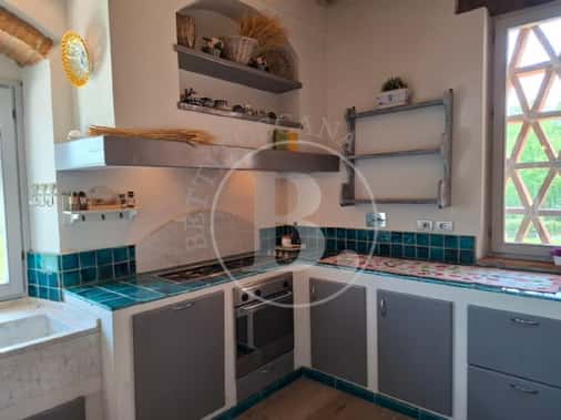 Una deliziosa strada di campagna di circa 2 km ci conduce alla proprietà da cui possiamo ammirare una stupenda vista panoramica; dalla grande loggia si entra nel salone e nella cucina, dal disimpegno si accede poi allo studio o camera ai due bagni e al ripostiglio/dispensa.