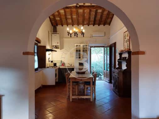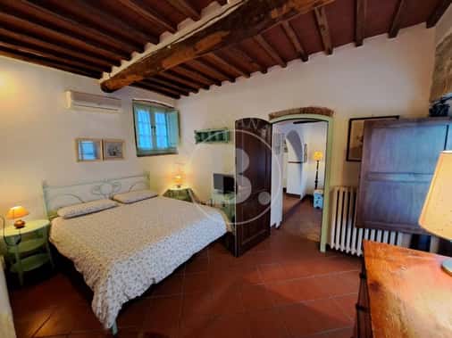 - L’appartamento padronale è composto al piano terra da un grande salone, la cucina, la sala con il caminetto e un bagno; scale interne conducono al piano superiore con le quattro camere e i due bagni.