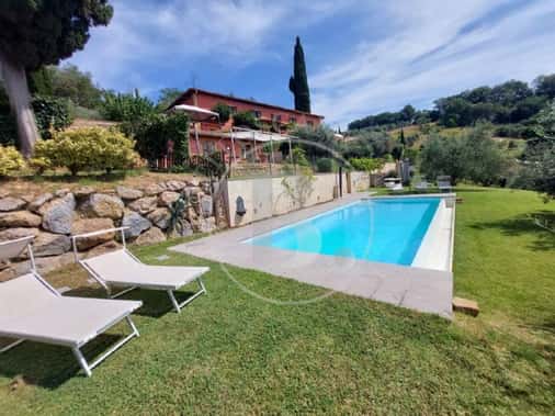 Dal terrazzo si scendono alcuni scalini e si accede al giardino con la pool house e da qui alla infinity pool (10 x 4 mt) con impianto a sale alla quale fanno da cornice naturale alcuni olivi e cipressi oltre ad una splendida vista.
