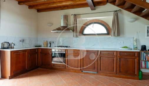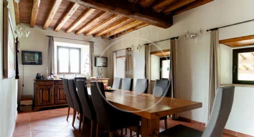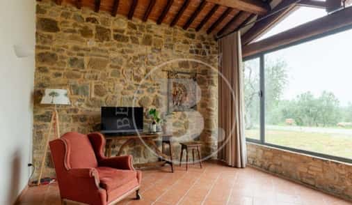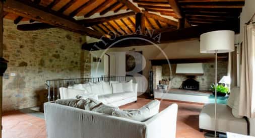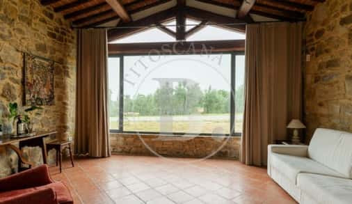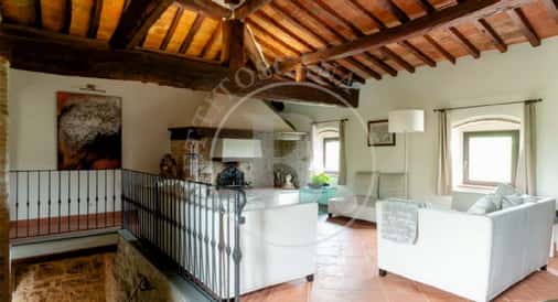 La casa colonica principale (mq. 355) su due piani, in pietra naturale, ha una superficie lorda di circa 355 mq. Al piano terra si trovano l'ampio soggiorno, la sala da pranzo e la cucina abitabile con il massimo livello di comfort. Di fronte alla cucina si trova la loggia coperta con vista mozzafiato sulle tipiche colline del Chianti. Al piano superiore c'è un secondo soggiorno accogliente con camino, trecamere da letto e due bagni.