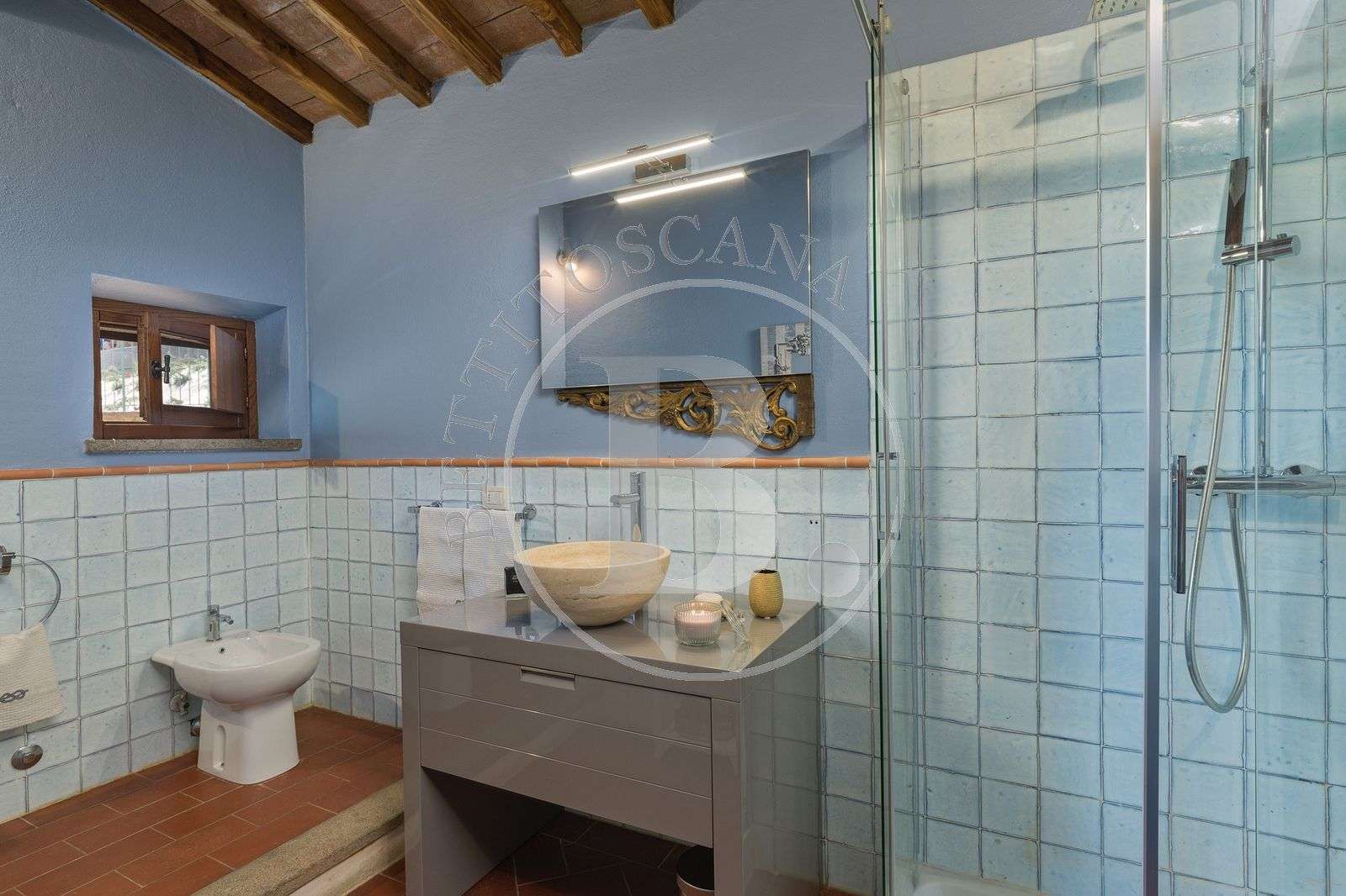 La proprietà è circondata da ca. 1,5 Ha di terreno ed è inserita in un interessante contesto protetto a nord con splendido affaccio sulla vallata; la superficie del casale è di circa 340 mq con una pool-house di mq. 50.