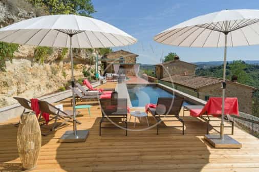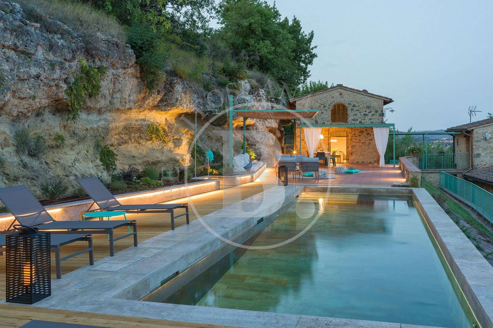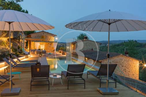 Completa la proprietà una PISCINA bordo sfioro (11 x 3 mt) riscaldata con idromassaggio e circa 15.000 mq. di terreno circostante.