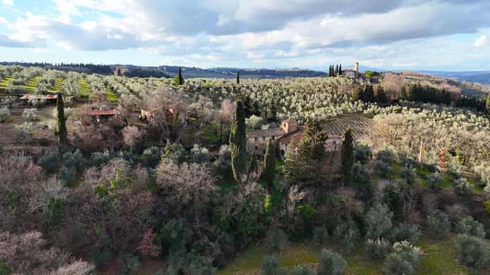 La proprietà, immersa in oltre 11 ettari di terreno, racconta la storia autentica della campagna toscana: 10 ettari di oliveti in piena produzione, un vigneto di Sangiovese di circa mezzo ettaro e due sorgenti, elemento prezioso che assicura una gran quantità d’acqua.