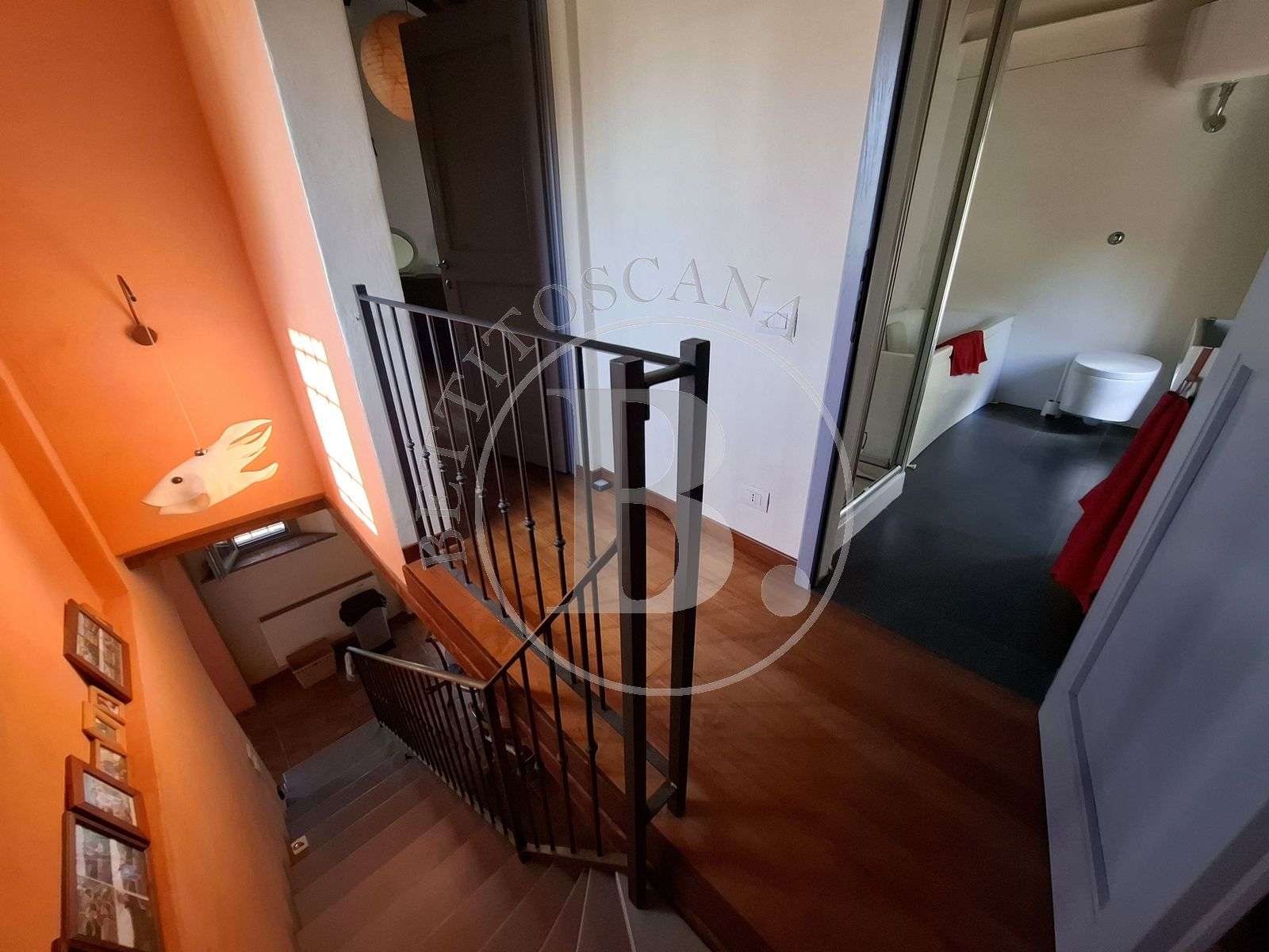 Una scala a vista accompagna al piano superiore, dove troviamo una luminosa camera matrimoniale con tre belle finestre panoramiche e un secondo bagno.